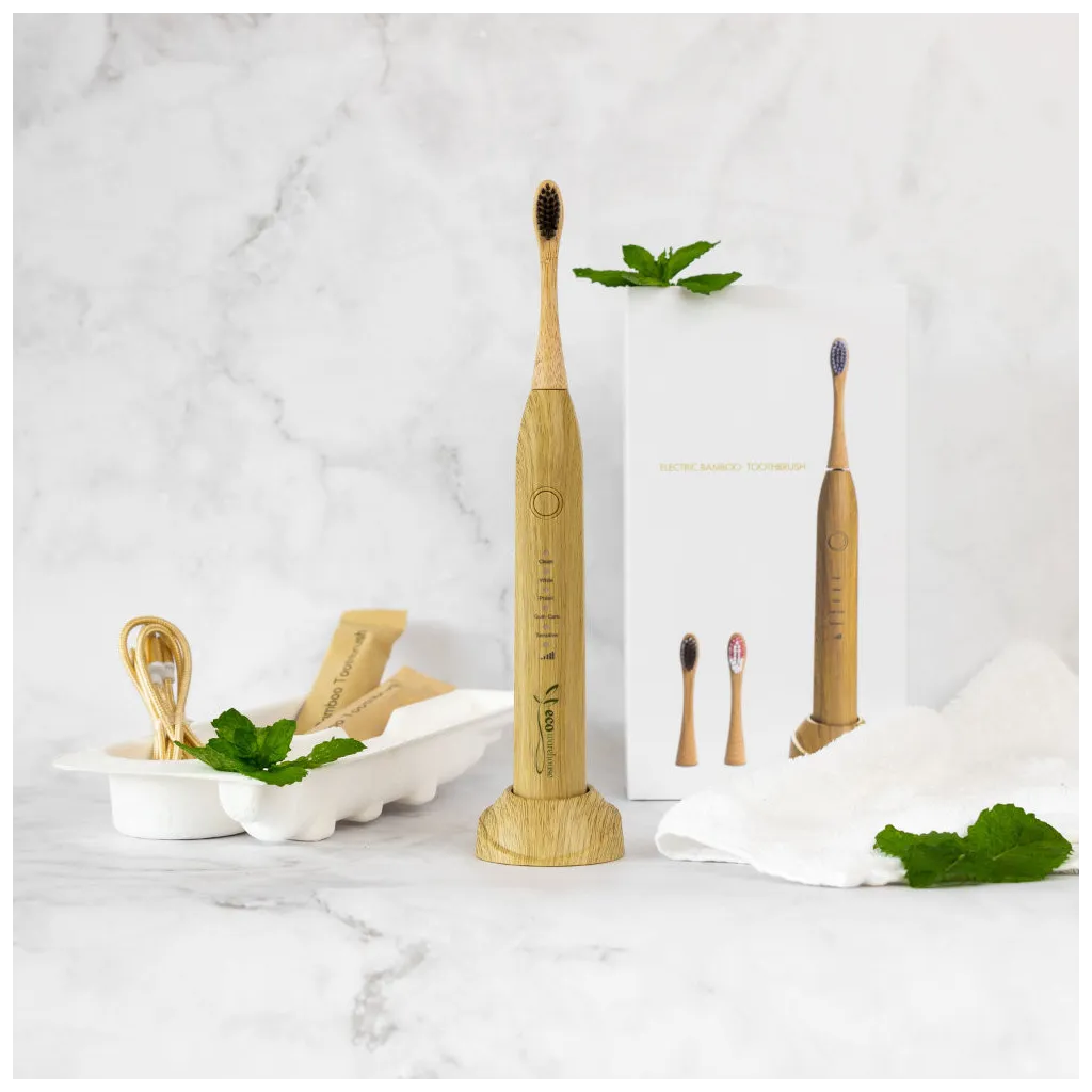1 Bamboo Electric Toothbrush, 3 Replacement Heads, 1 Charging Base, and 1 User Guide.